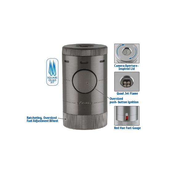The Xikar Volta Tabletop Quad Jet Flame Cigar Lighter is a premium accessory designed for cigar aficionados seeking both functionality and style. Its cylindrical metal body houses four powerful jet flames, ensuring a quick and even light for your cigars. The lighter features an oversized push-button ignition that fits flush against the body, providing a sleek and modern appearance.
